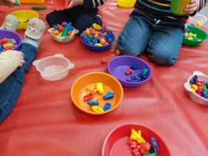 - éveil sensoriel (ateliers du goût, du toucher, jeux d’eau et de transvasement…)